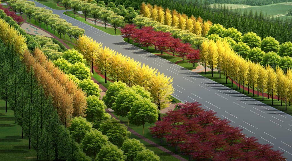10米寬花灌木景觀林帶以色彩多樣的花灌木搭配常綠的大葉黃楊、金森女貞、紅葉石楠等綠籬地被,層次鮮明,以連續(xù)的優(yōu)美弧線和折線成排交替的種植形式,呈現(xiàn)出道路景觀綠化的節(jié)奏感與序列感,不同色相的樹(shù)種呈現(xiàn)出不同的季相景觀,由道路向兩側(cè)由低到高搭配出不同的層次,以豐富的景觀層次和不同色相的樹(shù)種呈現(xiàn)出“四季常綠、三季有花”的季相景觀效果。