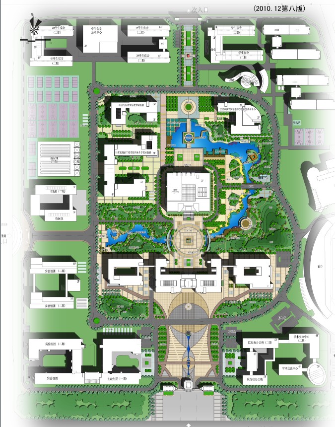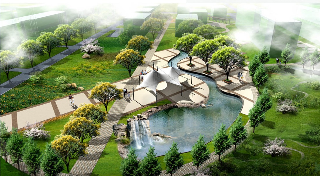 在設(shè)計(jì)總體布局中尊重場(chǎng)地現(xiàn)狀,環(huán)境上以“一軸一環(huán)一帶,五區(qū)十景”為景觀骨架。通過(guò)對(duì)基地特征的挖掘分析,運(yùn)用現(xiàn)代景觀設(shè)計(jì)與中國(guó)傳統(tǒng)造園手法,汲取江南園林的景觀精髓,師法自然,疊山理水,達(dá)到“雖由人作,宛自天開(kāi)”的境界,從整體意象上構(gòu)成了一湖一溪一島的水體景觀框架。該項(xiàng)目將古典園林造園手法與現(xiàn)代結(jié)合,形成了中國(guó)園林特有的山水格局,形成了宜人并充滿(mǎn)活力的景觀空間。