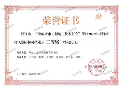 22年度海綿城市工程施工技術(shù)研究科技進(jìn)步獎(jiǎng)三等獎(jiǎng)